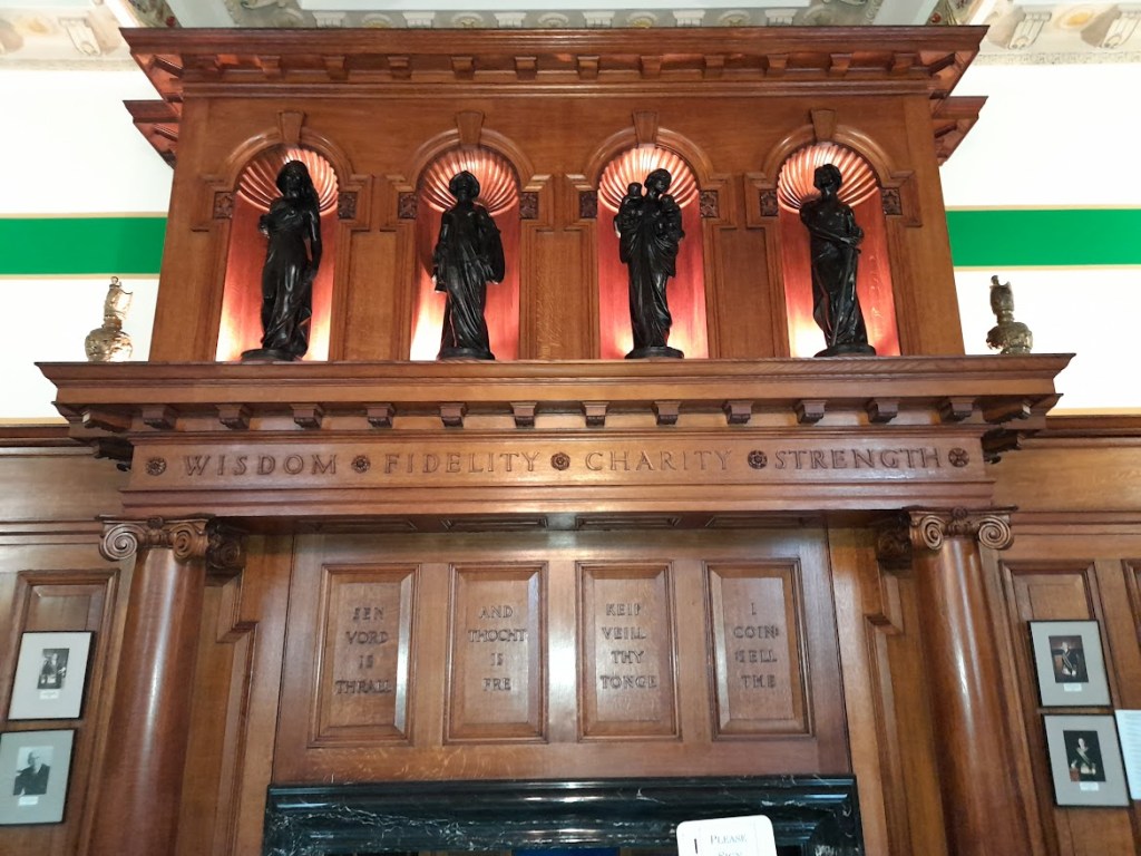 On entering the building the visitor is greeted with a magnificent Entrance Hallway with a wide-open fireplace created of antique marble surrounded by panelling. The panelling surrounding the Hallway, and which can be found throughout the building, is of Austrian Oak. There are four alcoves above the fireplace containing bronze figures representing ‘WISDOM’, ‘FIDELITY’, ‘CHARITY’, and ‘STRENGTH’.