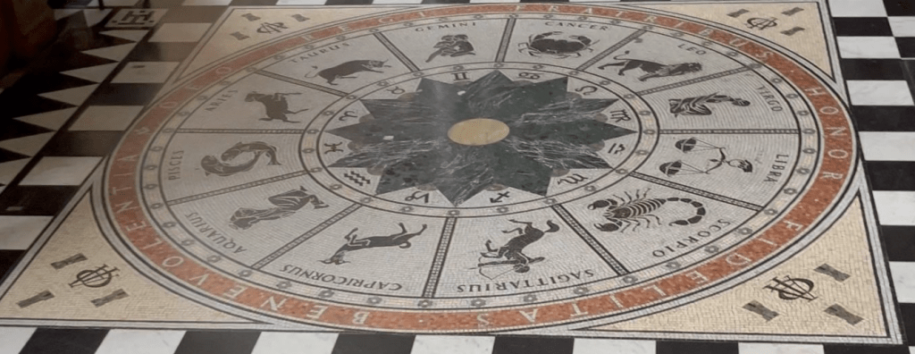The floor of the Entrance Hallway is inlaid in mosaic pattern with black and white marble and a magnificent eleven-foot diameter circle, showing the twelve signs of the Zodiac, in the centre; while the ceiling is adorned with colourful fruit and flower ornamentation.